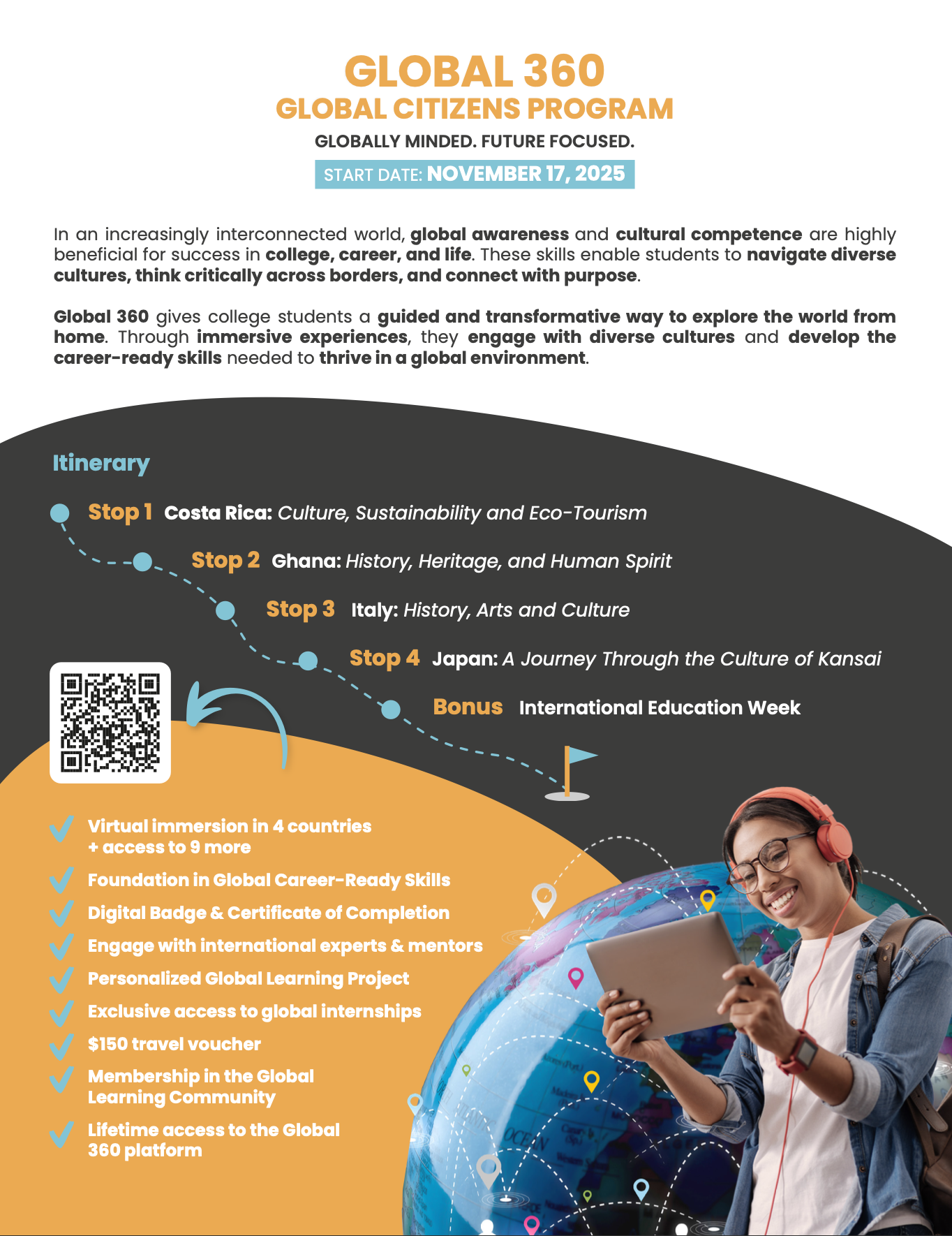 Global 360 – Global Citizens Program is a dynamic online program that builds Global Curiosity, fosters Discovery, and opens doors to lifelong Opportunities in a connected world—empowering students with in-demand Global Career-Ready Skills essential for thriving across cultures, careers, and communities.