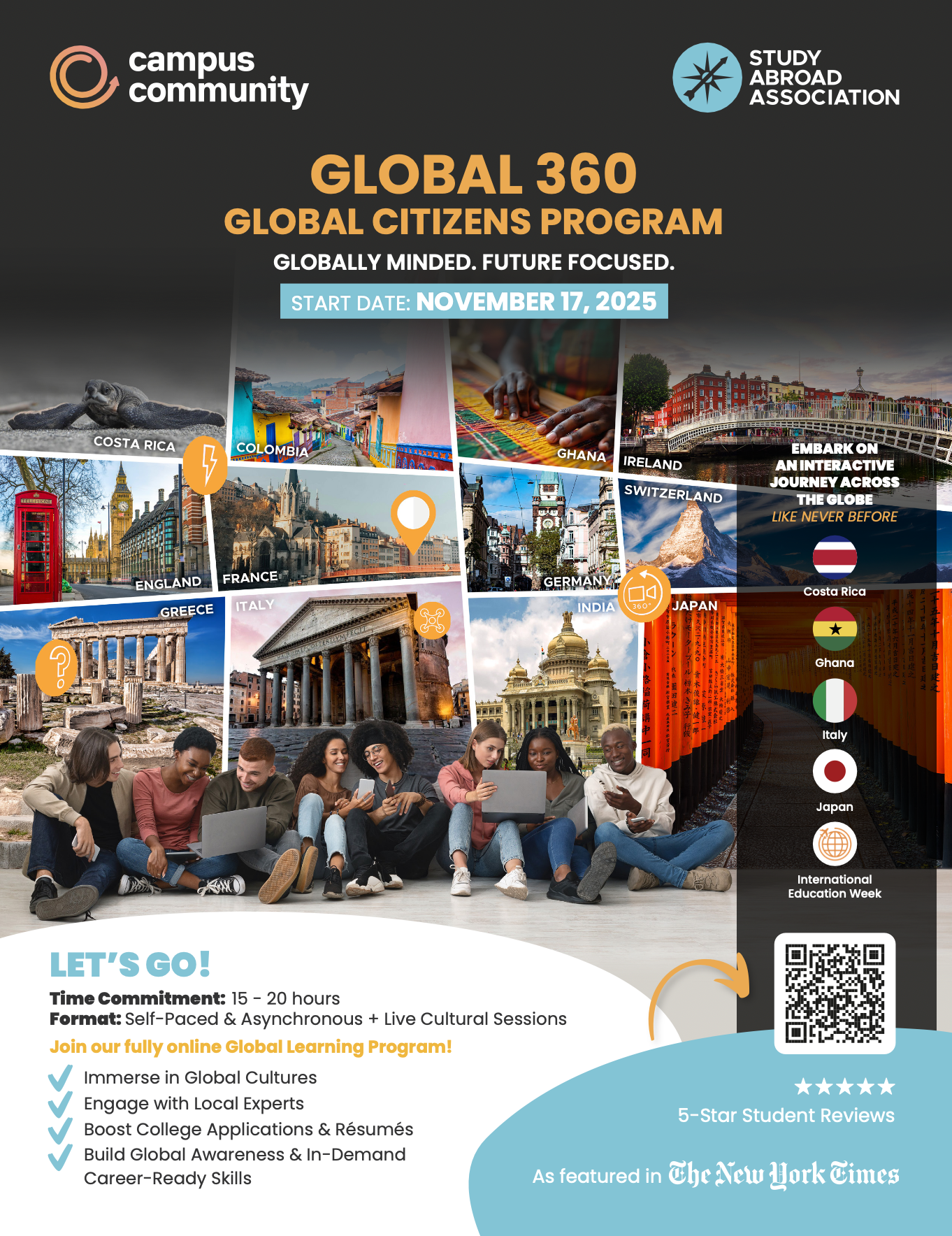 Global 360 – Global Citizens Program is a dynamic, fully interactive, and immersive online program powered by 360° technology. It offers an intercultural and multidisciplinary approach, focusing on current events, history, art, architecture, religion, philosophy, literature, music, politics, business, environmental science, sustainability, technology, gastronomy, and more. Upon completion, students will be able to appreciate the unique character of several global communities across twelve different countries. Each year, new destinations, global regions, and multidisciplinary topics are added to the experience. -